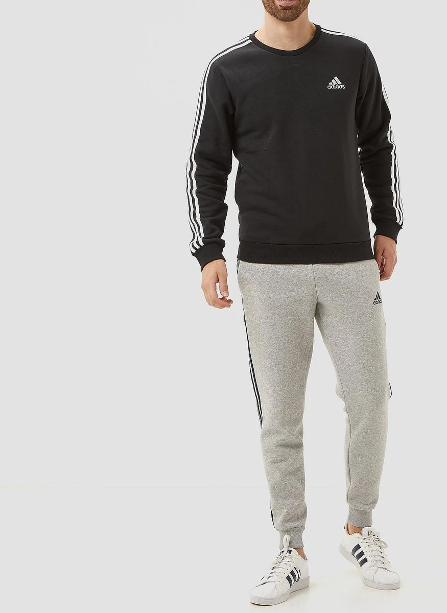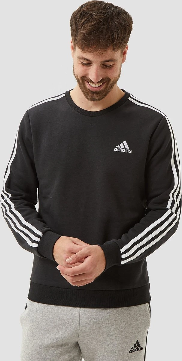 Houd jezelf warm tussen de trainingen door met de zwarte adidas Essentials 3-Stripes fleece sweater voor heren. Gemaakt van een combinatie van katoen en fleece ontbreekt het jou niet aan warmte. Op momenten waarop je iets minder warmte nodig hebt stroop je de mouwen makkelijk op met de geribde manchetten. De iconische adidas-strepen over de schouders en mouwen geven de hoodie een sportieve look.