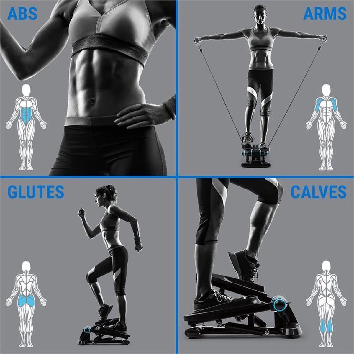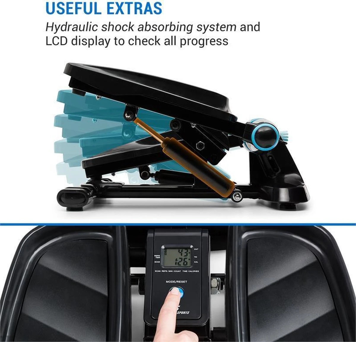 Rondom fit met de Capital Sports Galaxy Step mini stepper: Dit is de optimale thuistrainer voor het bevorderen van je conditie en hij heeft daarvoor maar heel weinig plaats nodig!Naast het verbeteren van je conditie brengt een eenvoudige, maar intense training met de Galaxy Step mini stepper, benen, billen en heupen in vorm en zet je vetverbranding aan de gang. Een verschil dat al na enkele trainingssessies tot een merkbaar beter lichaamsgevoel leidt. Dankzij de meegeleverde power ropes versterk je niet alleen de genoemde spiergroepen, maar, wanneer gewenst, ook gelijk je armen en borstzone.Op het LC display van de trainingscomputer kun je je prestatiegegevens, zoals calorieverbruik en stappen per minuut, zien en een instelbare timer ondersteunt je training met de gekozen tijdsduur. Aanvullend kun je met de gratis FitShow app je trainingsresultaten ook documenteren, opslaan en delen. Het hydraulische Shock Absorbing System en de grote premium tredes met rubberen coating zorgen op elk moment voor een zekere opstap en een licht gedempte impact om je gewrichten en pezen te ontzien. Dankzij de extreem grote tredes en robuuste constructie is de Galaxy Step mini stepper probleemloos te gebruiken met alle soorten trainingsschoenen en heeft een draagkracht van max. 120 kg.De rubberen antislip voetjes zorgen ervoor dat de mini stepper stabiel staat en dempen de impact bij complexe step choreografieën: Dat ontziet niet alleen de vloer, maar ook de zenuwen van de buren.Een groots apparaat voor thuis dat je in de stemming brengt: De Galaxy Step mini stepper van Capital Sports!