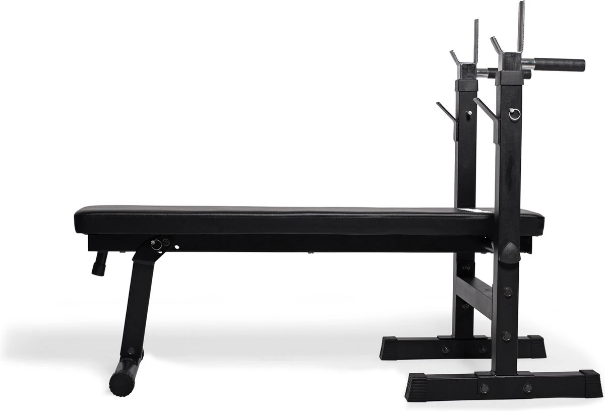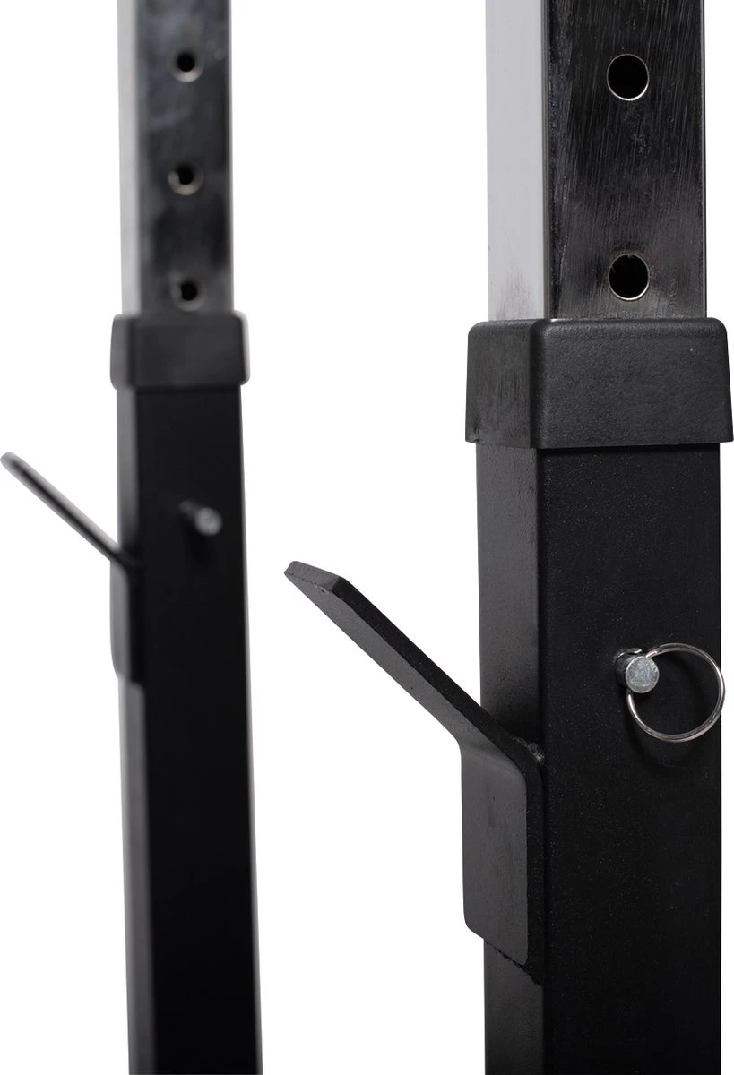 Deze halterbank heeft een haltersteun die je in hoogte verstelt om comfortabel te bankdrukken. Onder beide haltersteunen zit een aflegpunt voor als je aan het einde van een zware training de haltersteun niet meer haalt. De haltersteunen zijn belastbaar tot 180 kg. Op deze halterbank kan je zowel een 30 mm als een 50 mm halterset gebruiken. Beiden passen in de haltersteun en op het aflegpunt.