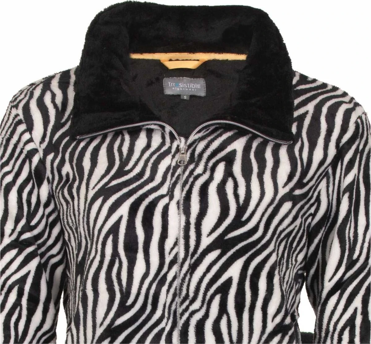 Irresistible dames huispak gemaakt van Coral Fleece 100 % Polyester. Dit huispak is heerlijk om in weg te dromen thuis of warm ingepakt de hond buiten te laten. De zebra dessin top is gemaakt van warme Coral fleece die heerlijk zacht aanvoelt. De top heeft Lange mouwen met boorden en een opstaande kraag die ook plat gedragen kan worden, ook heeft de top een deelbare rits en niet te vergeten zakken in de zijnaad. De Lange unie zwarte broek heeft zakken in de zijnaad en boorden aan de enkels