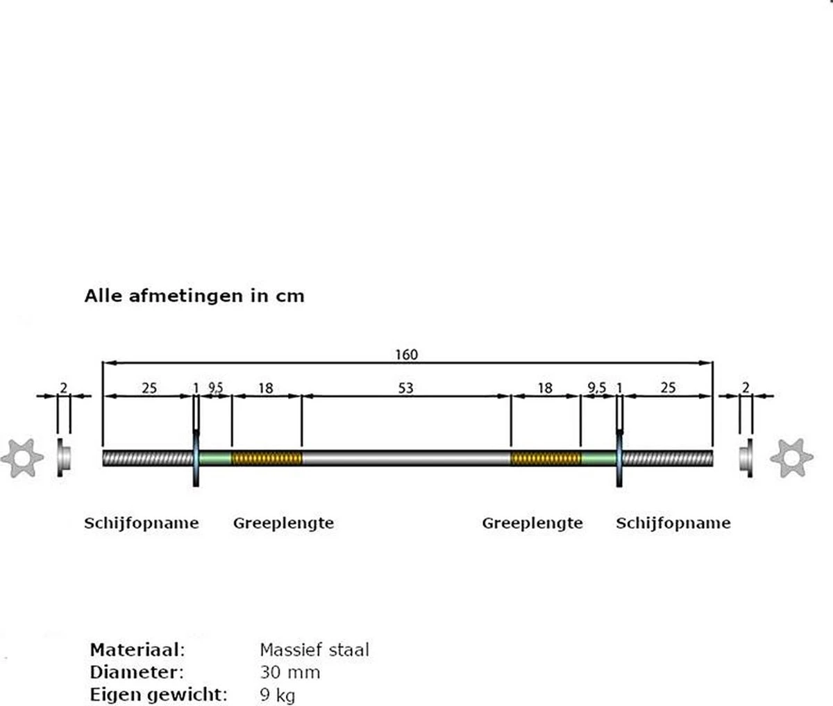- Korte halterstang: verchroomd staal, 42 cm lang, diameter 30 mm, 2,6 kg per stuk, max. belastbaarheid: 50 kg