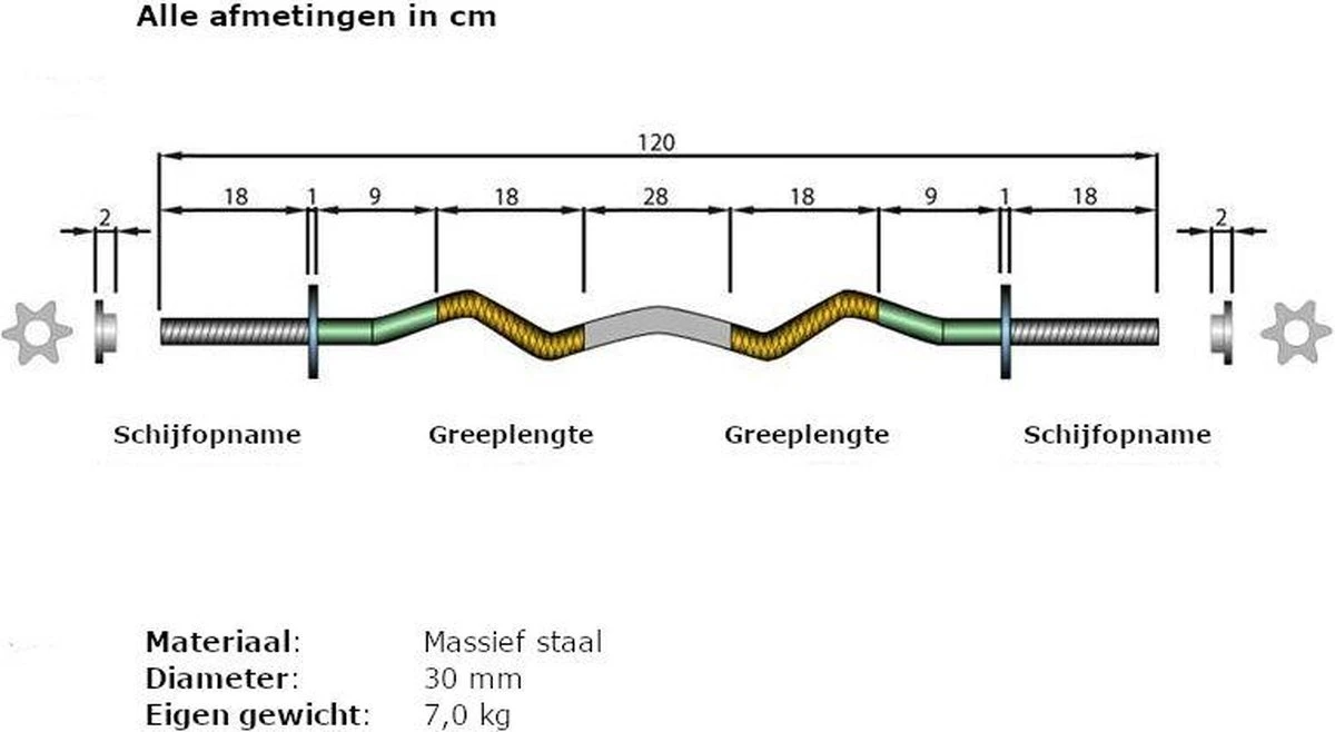- Curlstang: verchroomd staal, 120 cm lang, diameter 30 mm, 7 kg, max. belastbaarheid: 110 kg