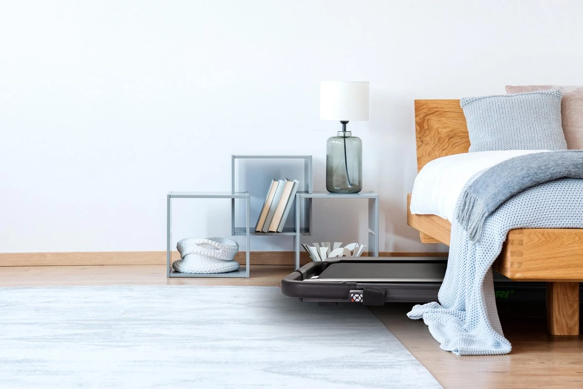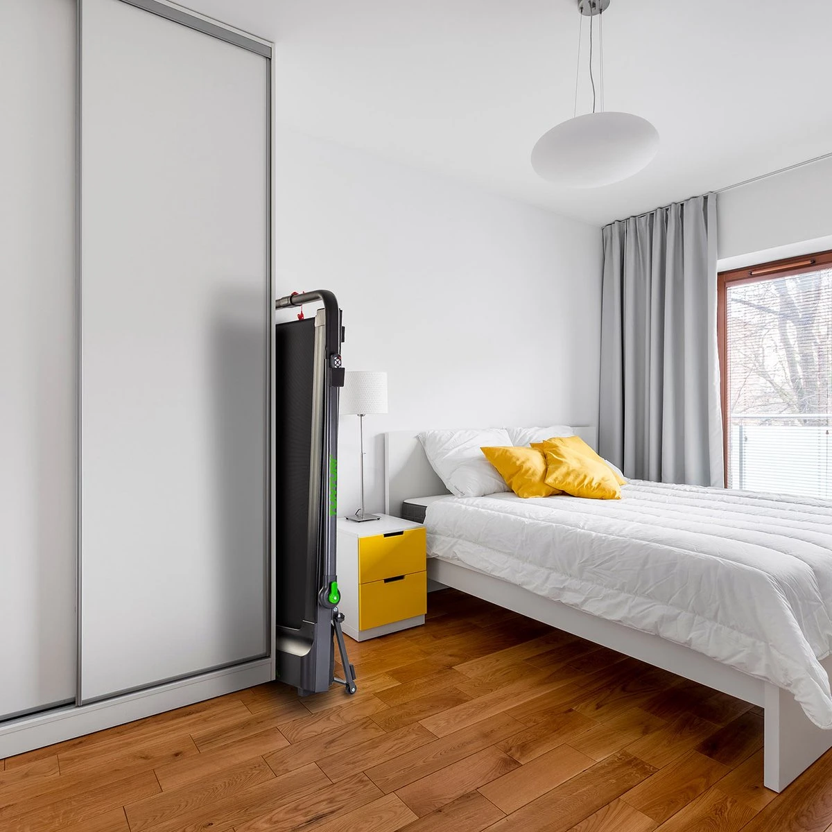 Na gebruik kan de Tunturi Cardio Fit T10 eenvoudig ingeklapt en opgeborgen worden. Ingeklapt is de loopband slechts 16 centimeter hoog! Ideaal om bijvoorbeeld onder het bed te schuiven of in of achter een kast op te bergen. De transportwieltjes aan het systeem maken het verplaatsen van de loopband zeer eenvoudig. Ben je toe aan een nieuwe training, dan is de loopband binnen no-time gebruiksklaar en kan de nieuwe training gestart worden.