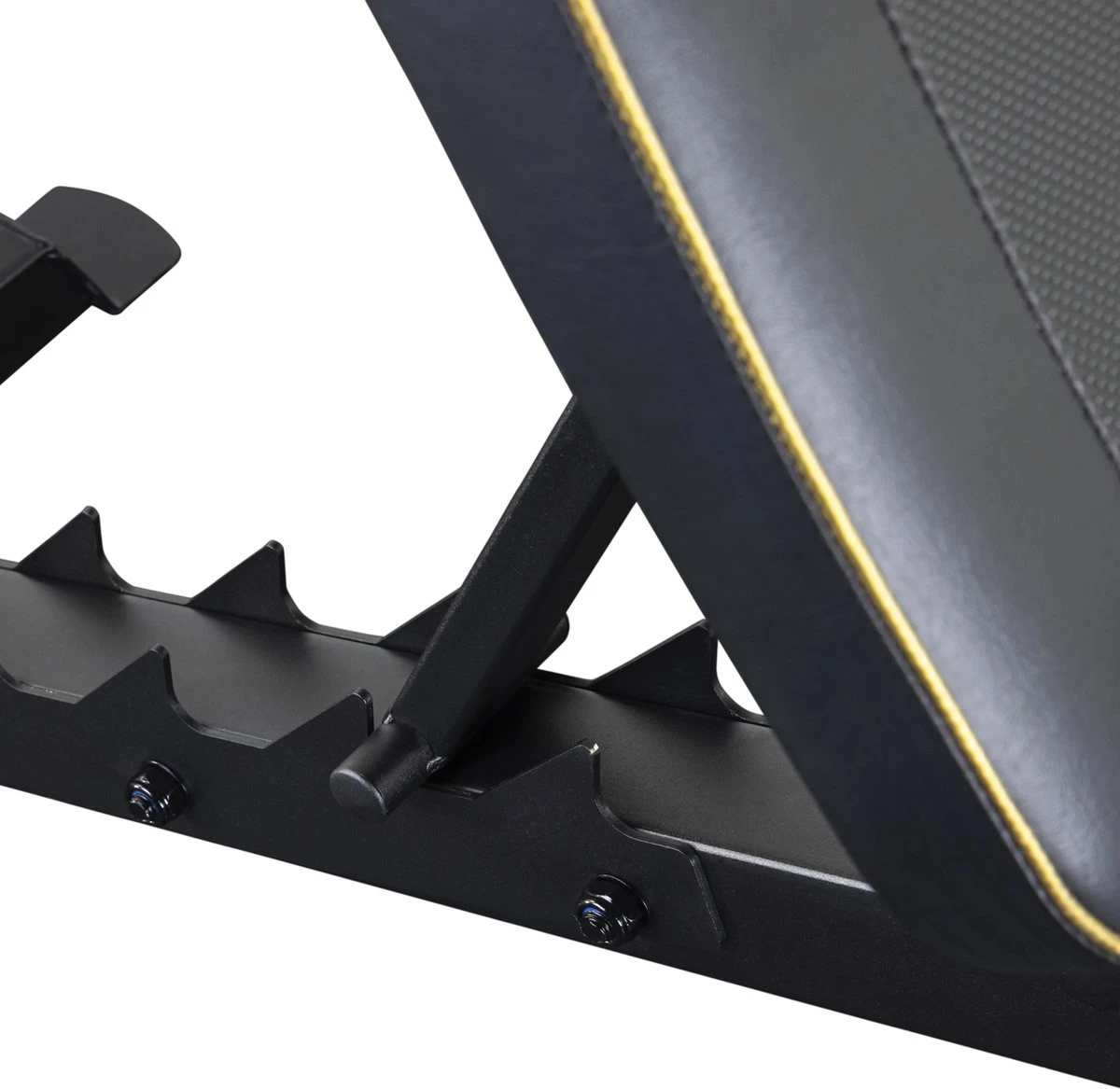 De gestikte zitting met extra stevige hoeken garandeert een lange levensduur van je halterbank en voorkomt slijtage op kwetsbare delen. Het frame van robuust staal zorgt voor de nodige stevigheid. De afwerking in een mat zwarte poedercoating geeft je bank een strakke uitstraling. De antislip rubberen vloerbeschermers zorgen dat de ondergrond niet beschadigd wordt.