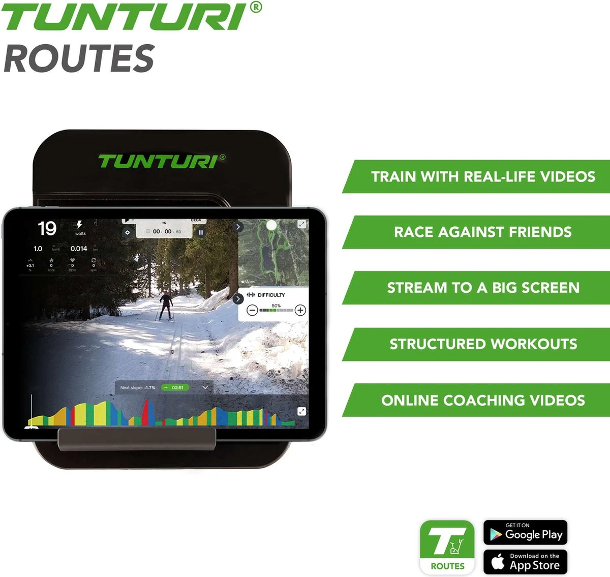 De Alpe d’Huez beklimmen op de fiets? Zoeven op ski’s door de sneeuw van de Alpen? Met Tunturi Routes blijft trainen leuk en uitdagend. De gratis versie van de app geeft altijd toegang tot vijftien video routes. Met de premium versie van Tunturi Routes heb je de keuze uit honderdduizenden kilometers aan routes over de hele wereld en honderden coaching video’s. Jouw training wordt een echte visuele belevenis!