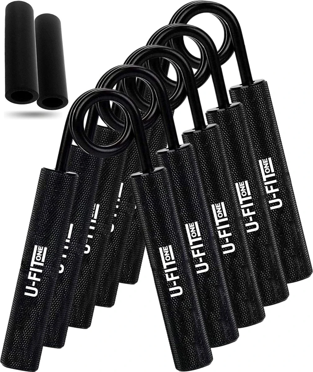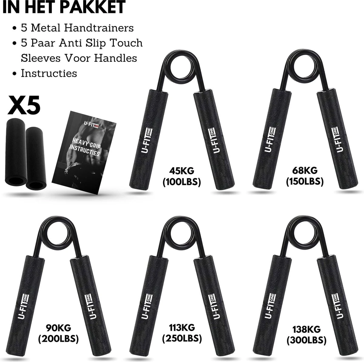 In het pakket : 5 Zwart Metal handtrainers [45kg(100lbs), 68kg(150lbs), 90kg(200lbs), 113kg(250lbs), 136kg(300lbs)], 5 Paar Soft Touch Sleeves voor handles