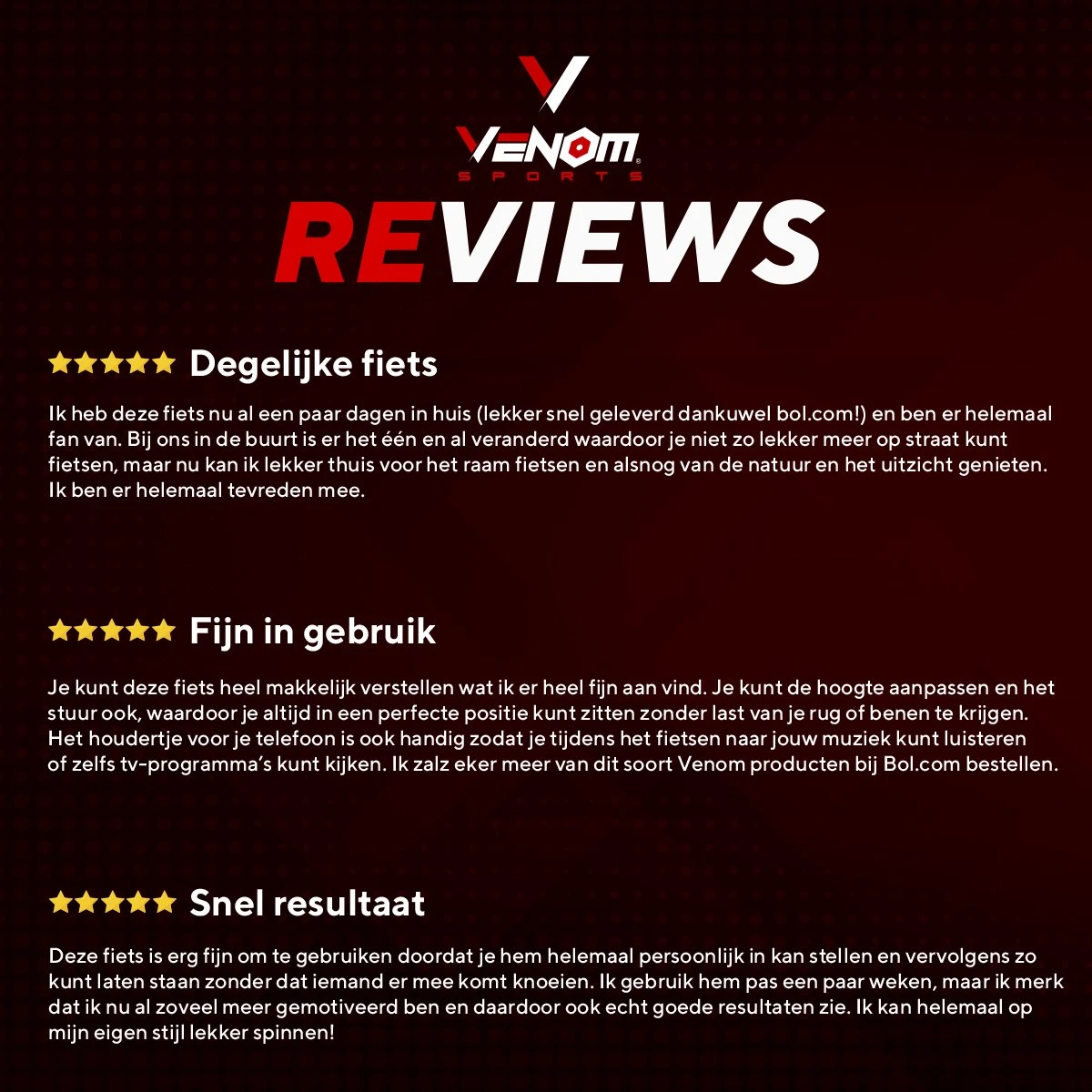 Venom Sports® is gemaakt voor én door de Nederlandse fitness liefhebber. De producten van Venom Sports® zijn zorgvuldig ontworpen voor de (thuis)sporter. Bij het ontwerpen en samenstellen van de producten is nauwlettend gedacht aan grip, vorm en materialen, zodat iedere beginnende en gevorderde sporter gebruik kan maken van de Venom Sports® artikelen. De gym producten zijn uitsluitend gemaakt van duurzame en sterke materialen, zodat jij elke dag opnieuw kan werken aan jouw sportieve doelstellingen. Venom Sports® is een ervaren e-commmerce leverancier in sportartikelen, zo kunt u altijd contact opnemen met de klantenservice en rekenen op de snelst mogelijke levering.