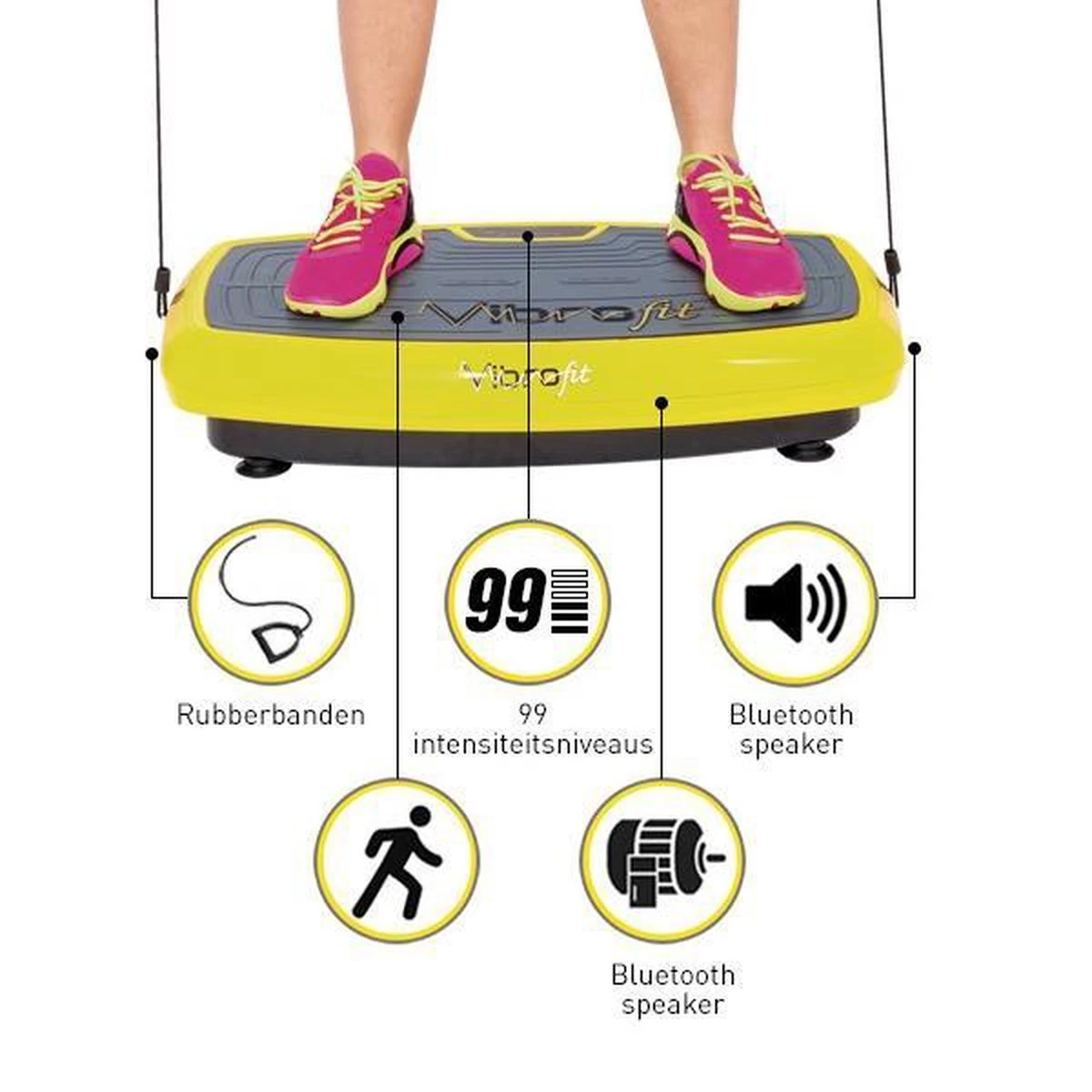Vibrofit biedt meer opties dan gewone trilplaten. Het is de enige op de markt die het ingebouwde geluidssysteem heeft, HiFi Zero Wire, met geïntegreerde Bluetooth, zodat u uw mobiele telefoon kunt koppelen en kunt genieten van uw favoriete muziek terwijl u aan het sporten bent.